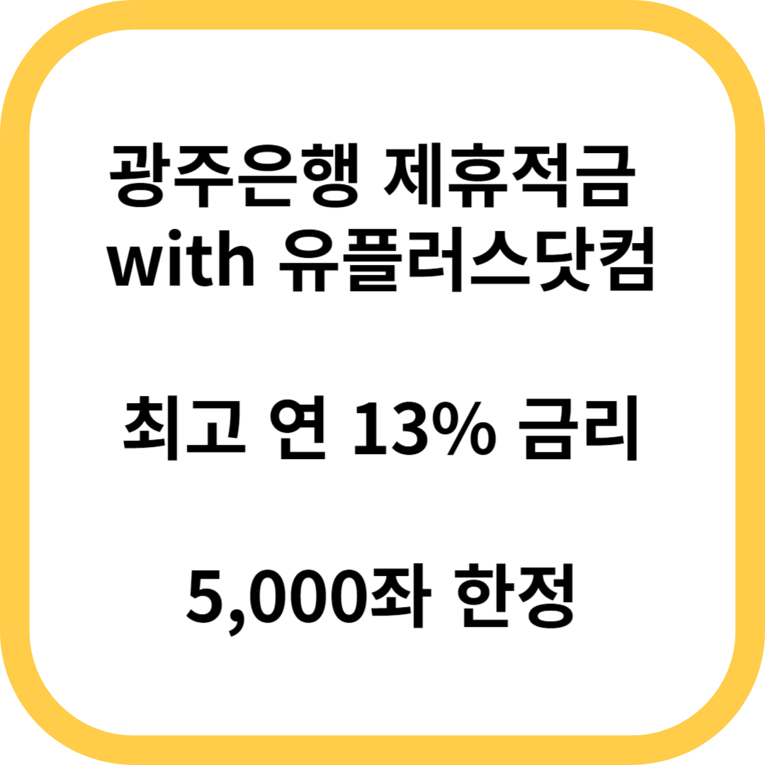 광주은행에서 LG유플러스 제휴 최고 연 13.0% 금리 저금 ‘광주은행 제휴적금 with 유플러스닷컴’ 상품이 출시 되었습니다. 선착순 5,000좌, 올해 12월 29일까지 판매 기한이 있기 때문에 서둘러서 신청하세요.